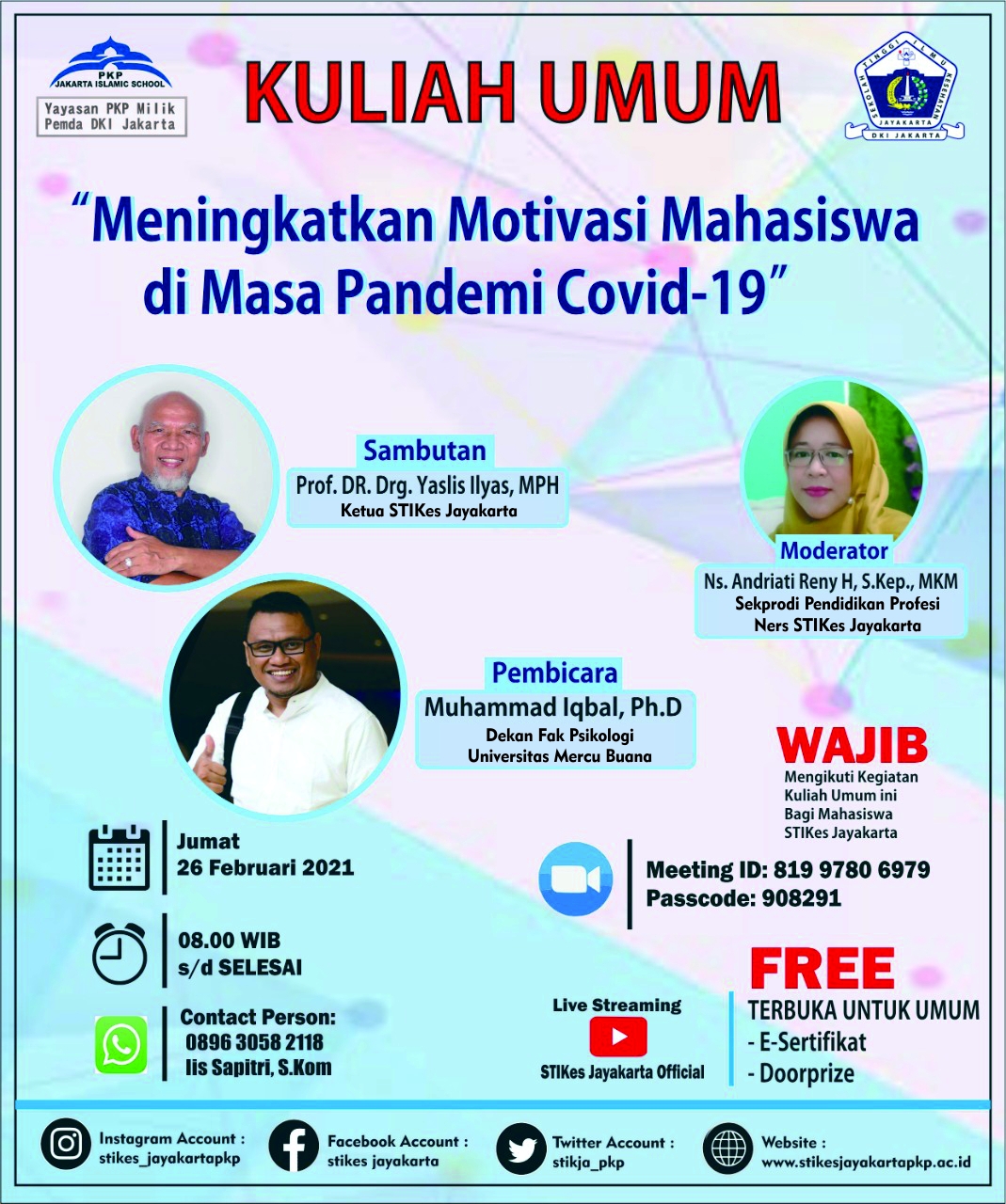 Mahasiswa STIKes Jayakarta WAJIB mengikuti kegiatan kuliah umum ini dan diharuskan Join Zoom Meeting sebelum jam 08.15 WIB