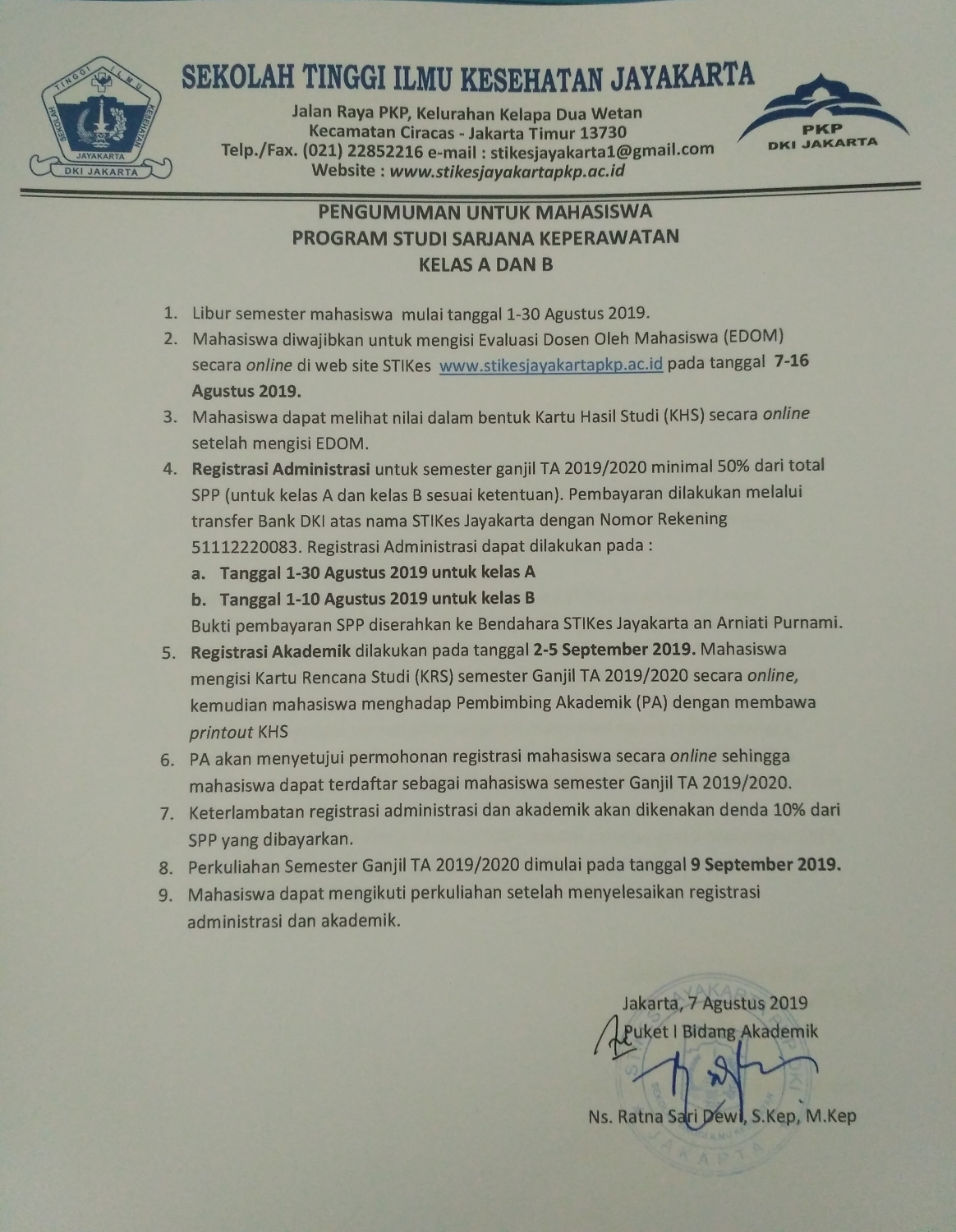 Pengumuman untuk Mahasiswa Program Studi Sarjana Keperawatan Kelas A dan B