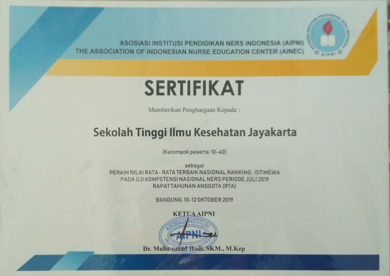 Selamat kepada Sekolah Tinggi Ilmu Kesehatan Jayakarta atas Peraih Nilai Rata-rata Terbaik Nasional Ranking Istimewa pada Uji Kompetensi Nasional Ners periode juli 2019.